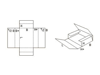 На схематическом изображении вы можете увидеть эти обёрточные ящики в развёрнутой форме. Боковые стенки по длине имеют бортики, каждый из которых равен половине от общей ширины упаковочного изделия.