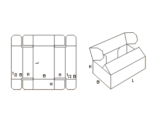 Более широкая часть, расположенная посередине развёрнутого листа, является дном ящика, тогда как все остальные за исключением двух длинных по бокам – его стенками. Крышка сформирована из двух отдельных частей – краёв цельного листа, которые содержат в общей сложности четыре клапана. После того, как коробка будет полностью собрана и закрыта, боковые стенки получаются утолщёнными, поскольку на них перекрещиваются клапаны.