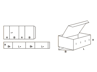 Вторая часть – это всё та же обечайка, разделённая на пять областей (FEFCO 0501). Две более узкие области представляют собой боковые стенки по длине, одна большая, расположенная между двумя предыдущими – дно, а четвёртая с самой маленькой пятой – крышку.