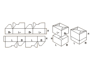 Дно каждого из двух лотков состоит из четырех попарно одинаковых клапанов. Она пара выполнена в виде трапеций, а другая имеет более сложное геометрическое строение. При более детальном рассмотрении можно прийти к выводу, что каждый из двух лотков FEFCO 0714 является клееной коробкой модели FEFCO 0700. Таким образом, вы можете использовать их как вместе, так и отдельно друг от друга (два лотка).