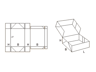 В разобранном виде речь идет о цельном листе гофрированного картона, основная часть которого образует прочные дно и крышку, а также две боковые стенки по длине. Боковые стенки по ширине формируются за счет клапанов сверху и снизу от основания. В то же время на вокруг прямоугольника, являющегося крышкой, расположены еще три клапана, по высоте меньше основных. За счет них обеспечивается наиболее плотное прилегание крышки к нижнему лотку модели FEFCO 0761.