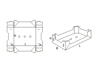 В разобранном виде FEFCO 0771 представляет собой цельный лист гофрированного картона, основная часть которого формирует прочное дно с наличием трех отверстий. Отверстия малые, поэтому товар через них не рассыплется, но зато будет дышать. По бокам от основной части вырезаны боковые стенки и клапаны, использующиеся для склеивания или скобирования упаковочного ящика. Причем сама по себе коробка собирается при помощи специальных отверстий и язычков, входящих в них.